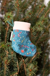 Skřítek je umístěn v modré punčoše, která ve tmě svítí, což dodává výrobku magickou a hravou atmosféru.