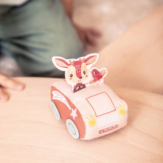 Měkké autíčko zdobí koloušek Stella a ptáček Robin, kteří přidávají na hravosti a atraktivnosti hračky.