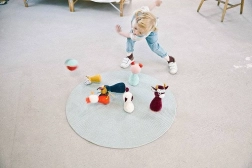 Tato textilní bowlingová hra rozvíjí jemnou motoriku (uchopování, házení), podporuje plazení a lezení a učí děti vztahům příčina–následek. Díky měkkým materiálům je hraní bezpečné a tiché – ideální do dětského pokoje i obýváku. Skvělý tip na dárek pro malé objevitele.