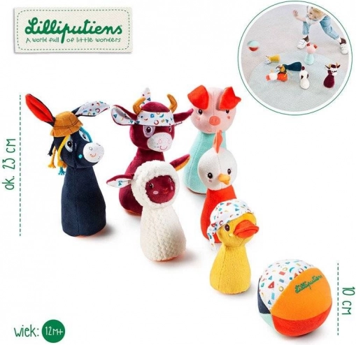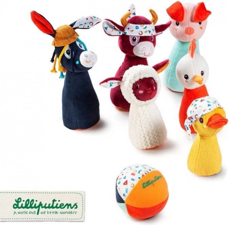 Objevte kouzlo měkkých kuželek Lilliputiens z kolekce Farma. Veselí hrdinové – oslík Ignace, kravička Rosalie, prasátko Simon, ovečka Yvon, slepička Paulette a kachna Gaston – mají stabilní spodní část s lehkým zatížením, takže se snadno staví a stejně snadno shazují. Součástí je i barevný plyšový míček s rolničkou, který láká k házení a kutálení.
