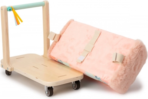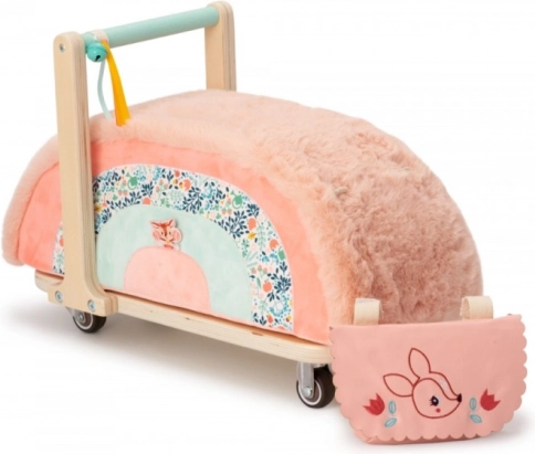 Přední kolečka s otáčením o 360° usnadňují zatáčení i na malém prostoru, zatímco zadní pevná kola drží směr. Praktický zvonek, odnímatelná taštička a omyvatelný povrch dělají z vozítka ideální hračku pro každodenní hraní i trénink motoriky.