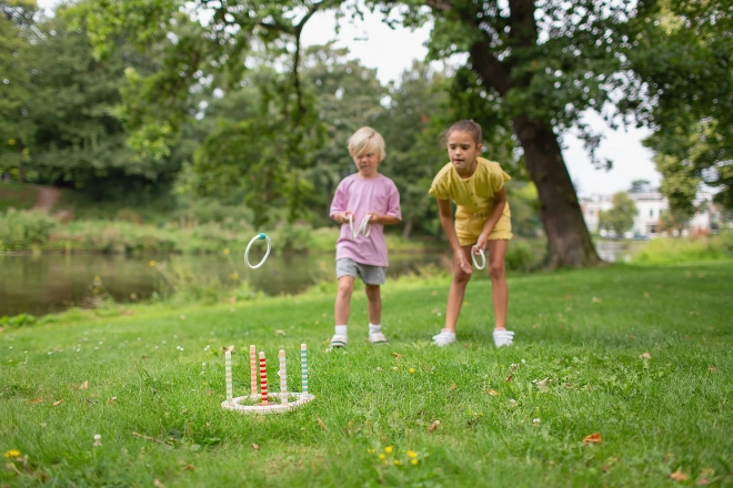 Tato tradiční hra s drevenou základnou a barevnými kroužky je ideální pro venkovní i vnitřní prostor. Vyzkoušejte své dovednosti v házení kruhů na barevné kolíky a sbírejte co nejvyšší skóre. Hra je zábavná a náročná, jelikož můžete upravit vzdálenost pro házení.