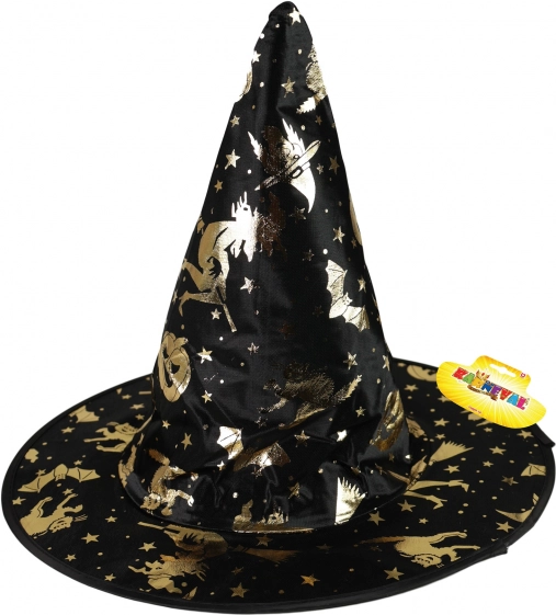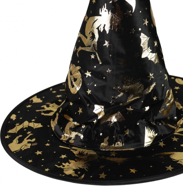 Stylový dětský čarodějnický klobouk je ideální na karneval, besídky a Halloween. Černý textilní klobouk zdobí zlaté magické motivy jako hvězdy, netopýři a čarodějnice. Díky klasickému kuželovému tvaru a široké krempě snadno doladí každý kostým a promění malého kouzelníka v halloweenskou hvězdu.