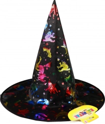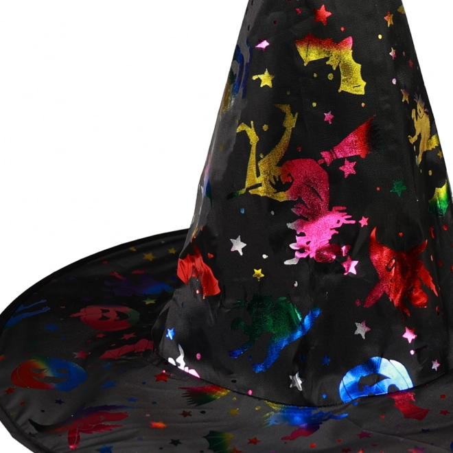 Klobouk zdobí barevné holografické motivy, které dodávají kouzelný vzhled.