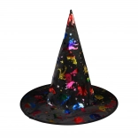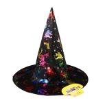Připravte se na Halloween nebo tematické večírky s tímto čarodějnickým kloboukem. Klobouk je černý s holografickými vzory představujícími netopýry a hvězdy, ideální pro každého, kdo chce vypadat výjimečně.