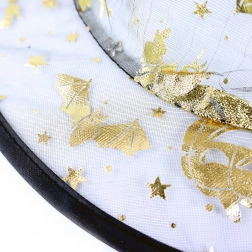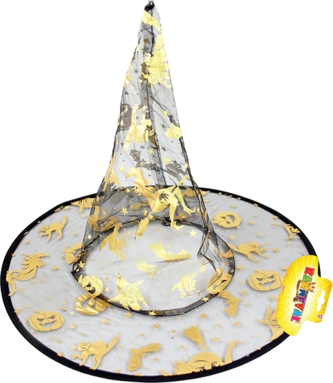 Klobouk je zdoben černými a zlatými motivy jako jsou dýně, hvězdy a čarodějnice, které přidávají tajuplný vzhled.