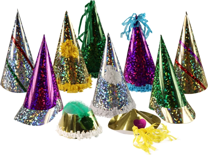 V balení najdete kombinaci kuželových kloboučků, variant s kšiltem a dekorů s krepatými střapečky pro pestřejší výzdobu.