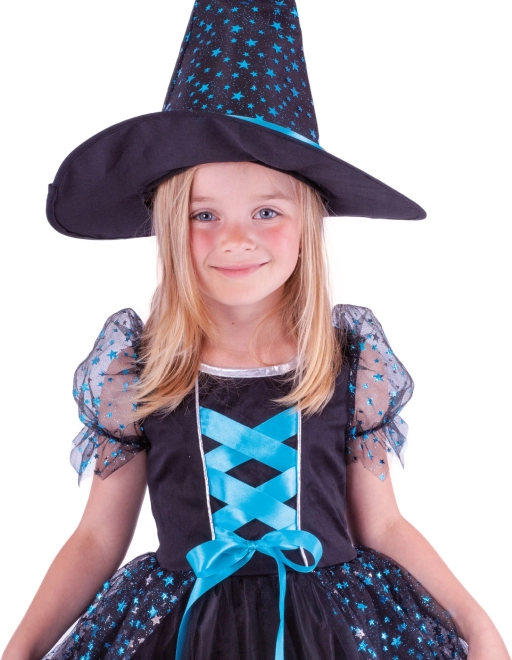 Šaty mají pohodlný střih pro volný pohyb, jsou zdobené tyrkysovou stuhou a třpytivými hvězdičkami, které dodávají kostýmu magický nádech. Skvěle se hodí na karneval, maškarní bál, tematické oslavy i halloweenské rejdy.