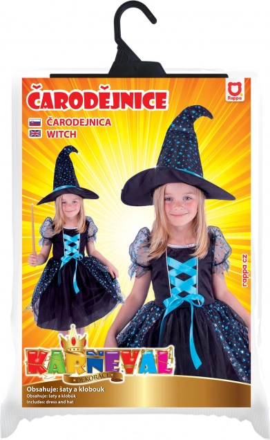 Tento kouzelný kostým čarodějnice ve velikosti S je určen pro děti ve věku cca 4–6 let (výška 105–116 cm). Kombinace černé a sytě modré barvy s hvězdným motivem vytváří efektní vzhled, který si malé čarodějky zamilují. Součástí je i špičatý klobouk sladěný s šaty.