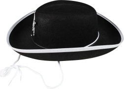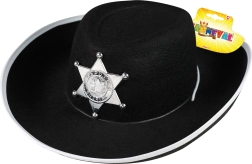 Dodejte kostýmu malého kovboje autentický vzhled. Tento dětský kovbojský klobouk v elegantní černé barvě zdobí výrazná šerifská hvězda a bílé lemování po obvodu, které dodává stylový kontrast. Šňůrka pod bradou zajistí, že klobouk dobře drží i při dovádění.