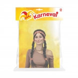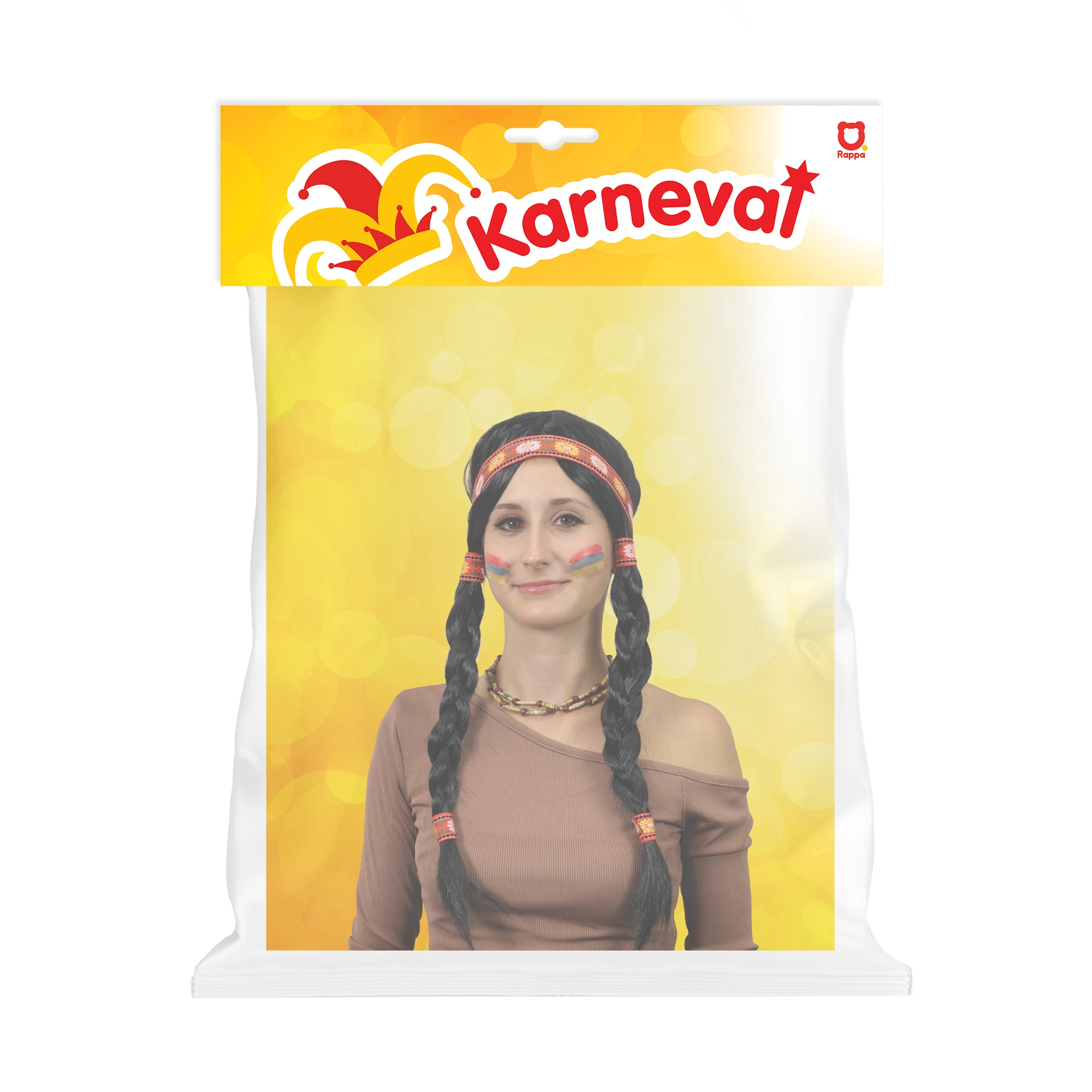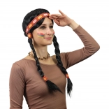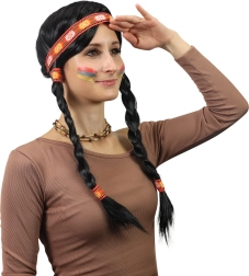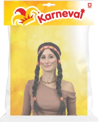 Součástí paruky je stylová čelenka a vzorované stuhy na copech, které zvýrazní indiánský vzhled a dodají kostýmu jedinečný charakter.