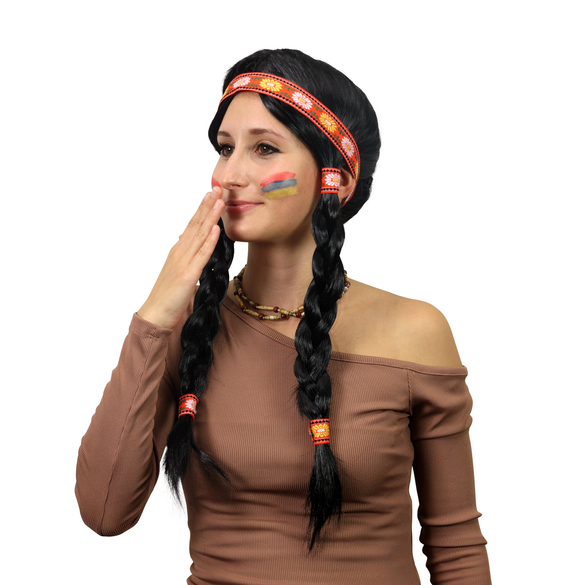 Stylová karnevalová paruka s dvojitými copánky a dekorativní čelenkou dodá vašemu kostýmu autentický indiánský nádech. Díky dlouhým černým copům, dekorativní čelence a pohodlnému nošení je ideální na karneval, tématické večírky i cosplay. Barva stuh se může lišit.