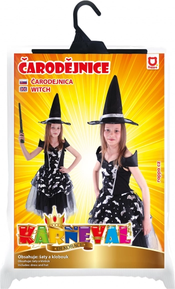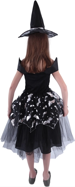 Tento kouzelný čarodějnický kostým je ideálním výběrem pro každou malou dámu, která se chce proměnit ve stylovou čarodějnici! Kostým zahrnuje černé šaty s netopýřími motivy, stříbrnými prvky a nadýchanou sukní, která dodává šatům správnou dávku elegance a tajemnosti.