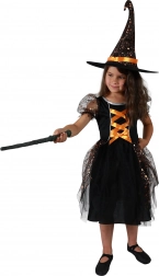 Šaty jsou bohatě zdobené oranžovými prvky a metalickými hvězdičkami, které zaujmou na první pohled. Kostým také zahrnuje čarodějnický klobouk, což celé sadě dodává autentický vzhled.