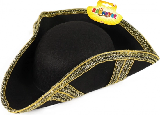 Klasický černý tricorn se zlatým lemem dokonale podtrhne pirátský kostým a dodá mu věrohodný styl.