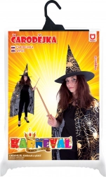Vstupte do světa kouzel s tímto elegantním čarodějnickým setem pro dospělé – černý plášť se zlatými motivy pavučin a sladěný špičatý klobouk vytvoří mystický, výrazný a fotogenický kostým na Halloween, karneval i tematické večírky. Lehký materiál zajistí pohodlné nošení po celý večer. Hůlka není součástí balení.