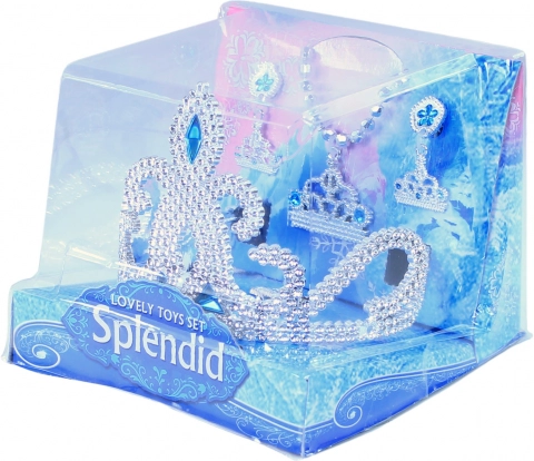 Dopřejte své malé princezně radost s touto okouzlující sadou, která zahrnuje korunku, náušnice, náhrdelník a prstýnek s modrými zdobnými prvky.