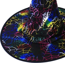 Dodejte svému halloweenskému či karnevalovému kostýmu jedinečný nádech s elegantním černým kloboukem čarodějnice zdobeným barevnými pavučinami. Lehký a poddajný materiál se pohodlně nosí, zatímco široká krempa a kuželová špička vytvářejí ikonickou siluetu.