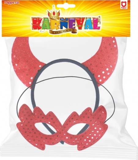 Povyšte svůj kostým na další úroveň s elegantní sadou, která kombinuje výrazné červené rohy a lehkou textilní škrabošku. Flitry se krásně třpytí při každém pohybu a zaručí, že na parketu jen tak nezapadnete.