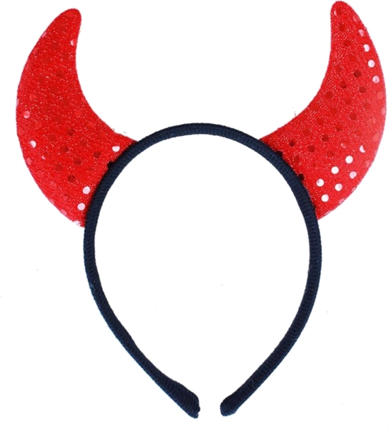 Červené rohy s flitry na černé čelence vytvoří výrazný čertovský look během vteřiny – ideální doplněk pro party a karneval.