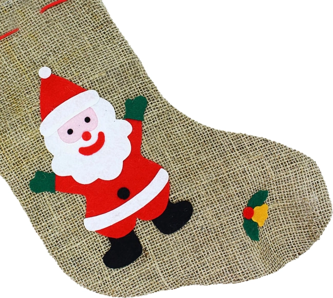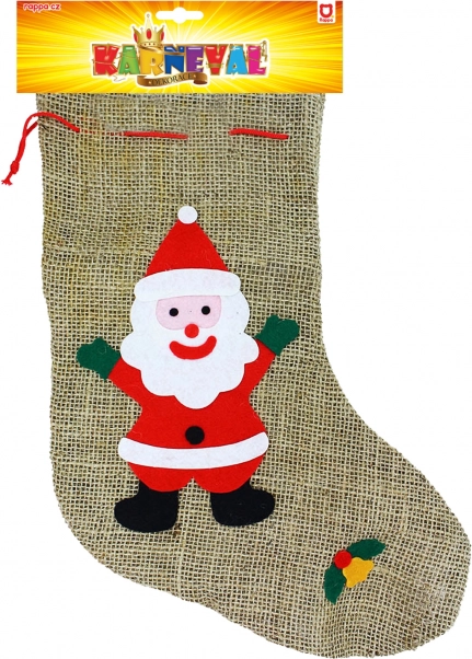 Tradiční mikulášská punčocha z jutové pytloviny s praktickým poutkem a ozdobným potiskem. Do prostorné punčochy se vejde spousta dobrot a drobných dárků. Ideální pro Mikuláše a Vánoce, bezpečná pro děti od 3 let, velikost 38 cm.