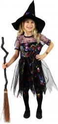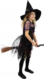 Dopřejte malé čarodějce perfektní převlek, který vynikne na každé párty. Lehké a příjemné šaty v černo‑fialovém ladění zdobí pestré halloweenské motivy, které dodají kostýmu hravý a magický vzhled. Součástí je sladěný špičatý klobouk, který dotváří klasický čarodějnický styl.