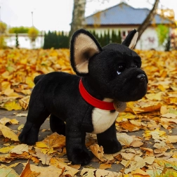 Tento černý francouzský buldoček s červeným obojkem vyniká detailně propracovanými rysy a měkoučkým povrchem, který přímo vybízí k pomazlení. Díky ručnímu zpracování působí velmi realisticky a stane se oblíbeným společníkem dětí již od narození.