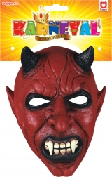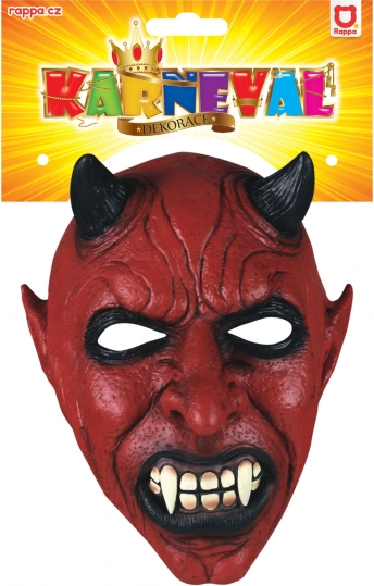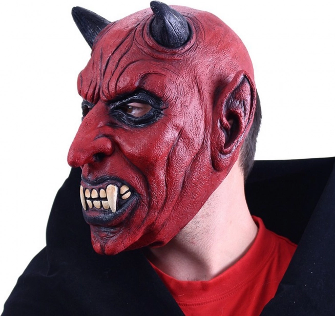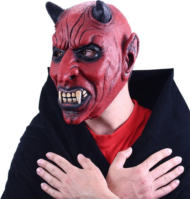 Vysoce detailní latexová maska s realistickými prvky čerta, včetně černých rohů a ostrých zubů, které přidávají na děsivé autenticitě.