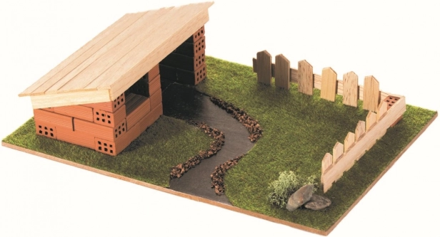 - více než 30 přírodních hliněných cihliček, více než 1,8 m dřevěných prkének, základová deska, obrázkový návod, papírové figurky, dekorační doplňky, lepidlo
