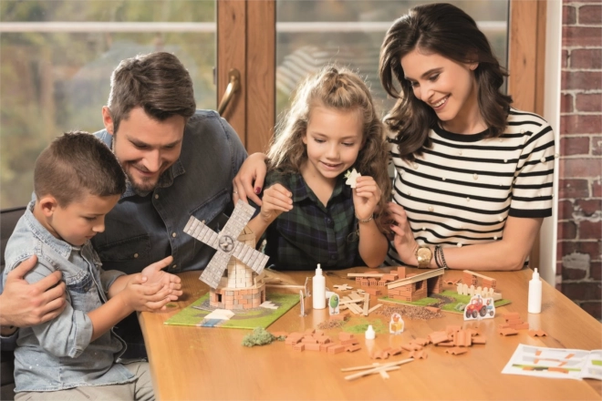 - Skutečné materiály: přírodní hliněné cihličky a dřevěná prkénka pro realistickou stavbu.