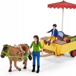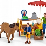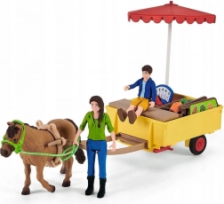 - 2 figurky (Ben a Laura), kůň/poník Poppy, vůz s plachtou, mobilní stánek, váha, bedýnky a farmářské produkty, doplňky