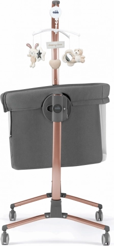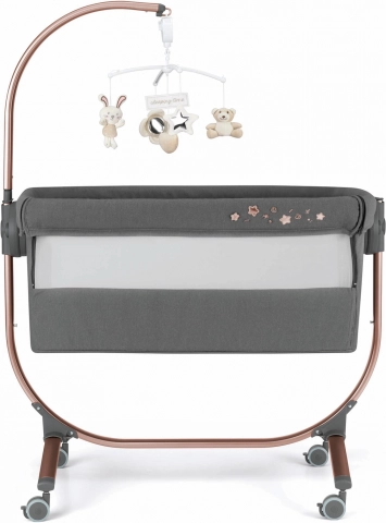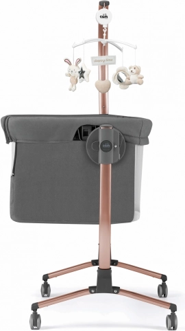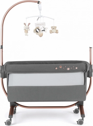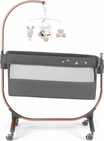 Stabilní kovová konstrukce se 4 kolečky (2 s brzdou) usnadňuje přesouvání po bytě. Postýlka nabízí možnost pevného ukotvení i jemného houpání, které děťátko uklidňuje a podporuje klidné usínání. Součástí je hudební kolotoč s roztomilými plyšovými hračkami pro zrakovou stimulaci a relaxaci.