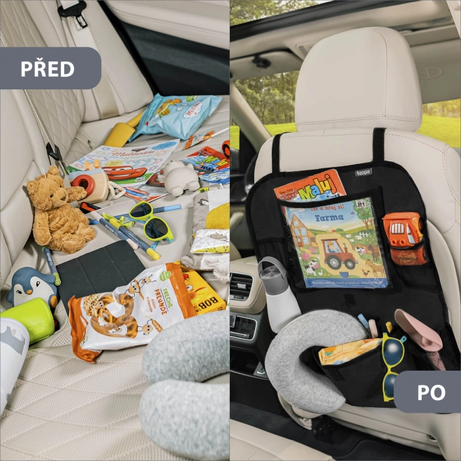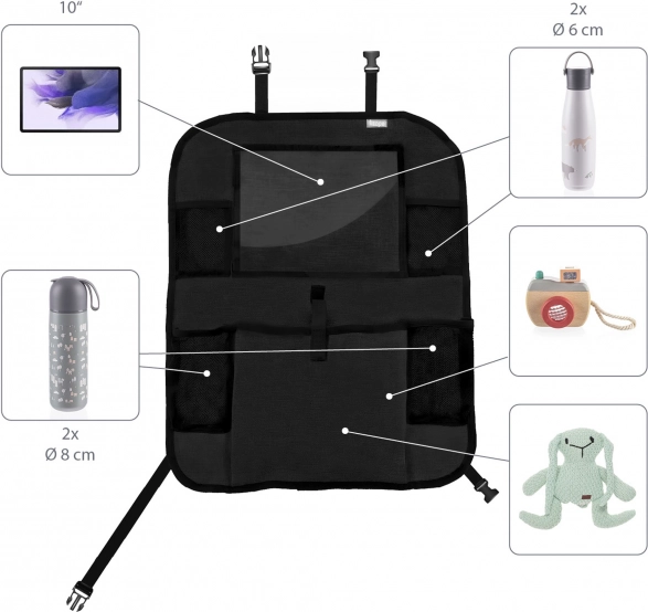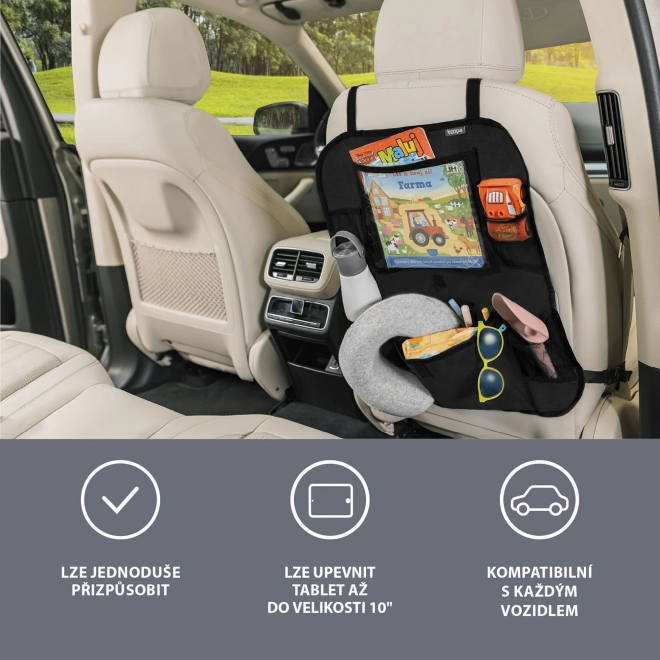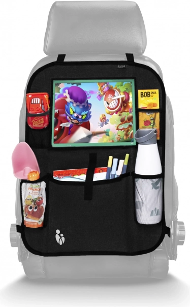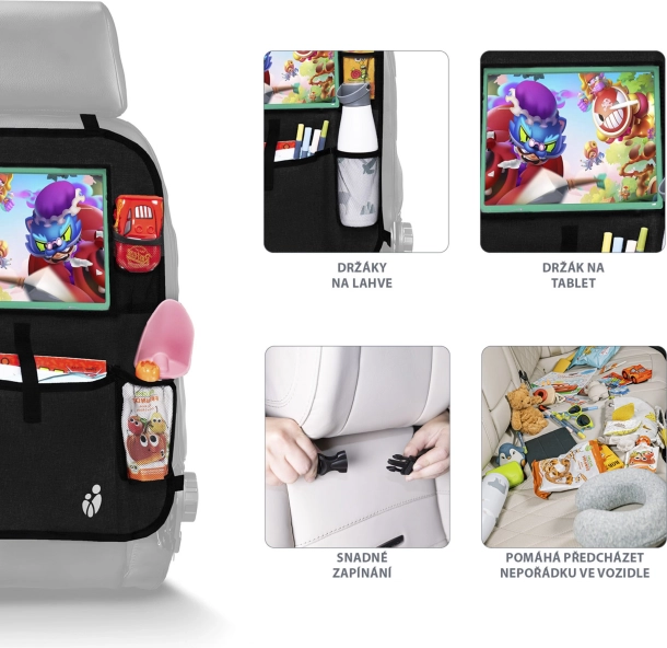 Organizér na sedadlo s průhlednou kapsou na tablet do 10", dvěma držáky na láhve a síťovými kapsami. Snadná instalace, univerzální pro většinu aut.