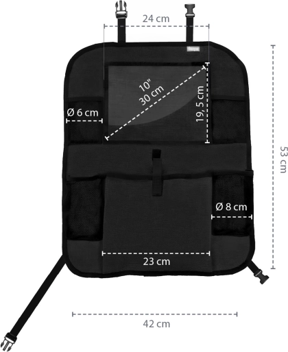 Praktický organizér na zadní stranu sedadla s průhlednou kapsou na tablet je ideální pro rodinné cesty. Nabízí rychlý přístup k tabletu, ochranu dotykové obrazovky a dostatek úložného prostoru na drobnosti a nápoje. Univerzální uchycení se nastavitelnými sponami zajišťuje kompatibilitu s většinou vozidel.