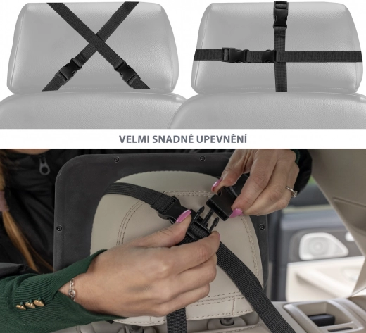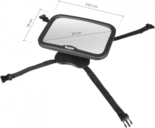 Montáž je rychlá a intuitivní – nastavitelné popruhy umožňují uchycení na většinu opěrek hlavy a stabilní fixaci do tvaru „X“ nebo „kříže“. Zrcátko snadno vyčistíte suchým nebo mírně vlhkým hadříkem, takže bude vždy připravené k použití.
