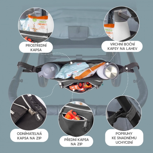 - Snadné upevnění: Upevňuje se pomocí páskům na suchý zip k většině kočárků.