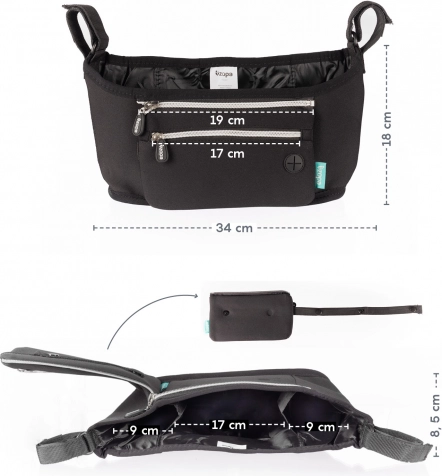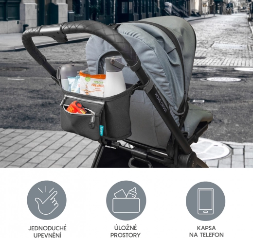 Univerzální neoprenový organizér na kočárek, který chrání vaše věci a nabízí snadné upevnění na většinu kočárků pomocí suchých zipů.