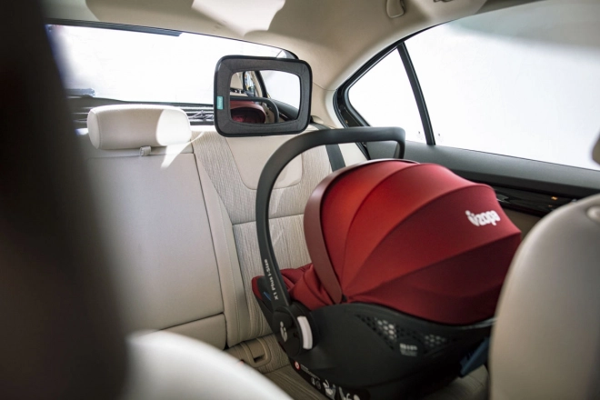 Instalace je rychlá a snadná – zrcátko stačí připnout nastavitelnými popruhy k hlavové opěrce. Produkt prošel mnoha bezpečnostními testy, takže se můžete spolehnout na bezpečné používání během celé jízdy.