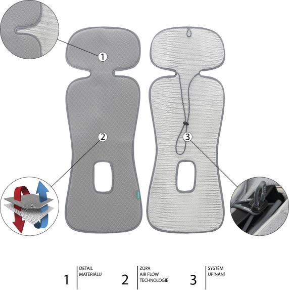 Speciální tkanina s 3D hexagon strukturou umožňuje proudění vzduchu mezi dítětem a autosedačkou, čímž snižuje pocení a udržuje příjemnou teplotu i v létě.