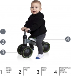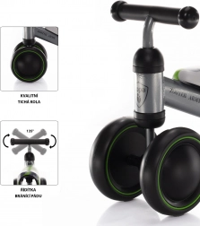 Odrážedlo pro děti Army přináší kombinaci atraktivního designu a praktických funkcí. Díky své lehkosti a technologii „silent wheels“ nabízí velmi tichou jízdu, což ocení zejména rodiče. Je koncipováno pro děti s váhou od 18 do 20 kg, což z něj činí ideální první kolo pro mladé jezdce.