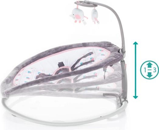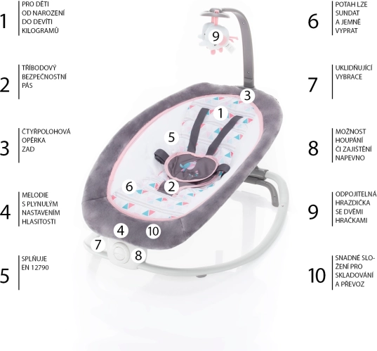 Integrovaný hrací mechanismus nabízí příjemné vibrace a mnoho melodií, jejichž hlasitost můžete snadno regulovat. Hrazda s odnímatelnými hračkami zajišťuje, že se vaše dítě nebude nikdy nudit.