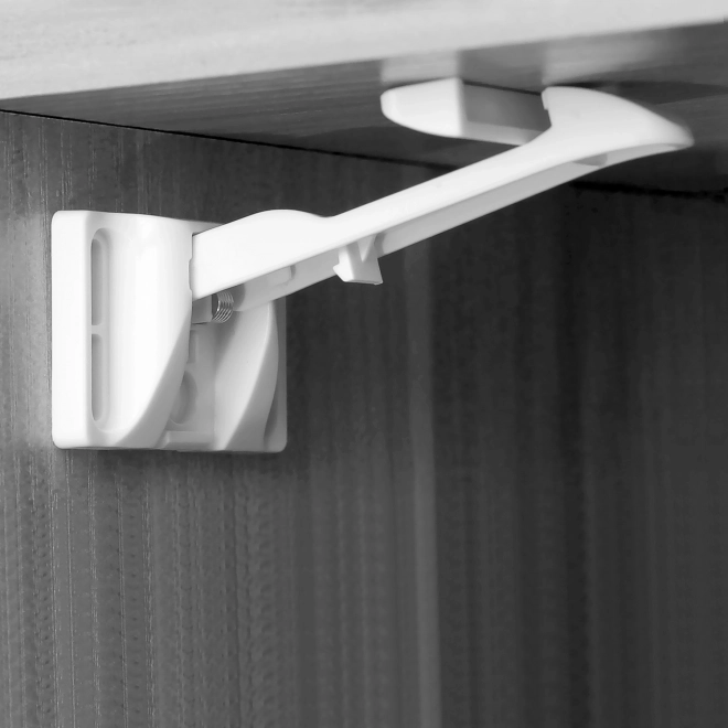 Zámek účinně brání úplnému otevření dvířek či zásuvek, aby se děti nedostaly k nebezpečným předmětům, a přitom umožňuje dospělým snadné uvolnění.