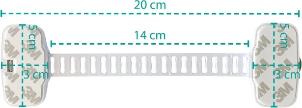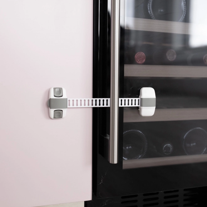 Flexibilní popruh jednoduše přizpůsobíte rozteči mezi dvířky či madly, takže zámek sedí na lednici, skříňkách i zásuvkách.