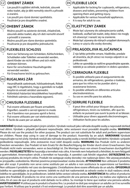 Zámek je vhodný pro skříňky, zásuvky, lednice, pračky i víka toalet. Flexibilní pásek se přizpůsobí rovným i členitým místům.