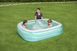 Praktický a odolný bazén v elegantní tyrkysovo-bílé barvě je ideální pro horké dny na zahradě. Díky měkkým nafukovacím stěnám je pohodlný pro děti a bezpečný pro rodinné hrátky. Při složení zabere minimum místa, takže je snadné ho přenést či uskladnit.