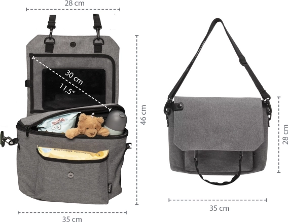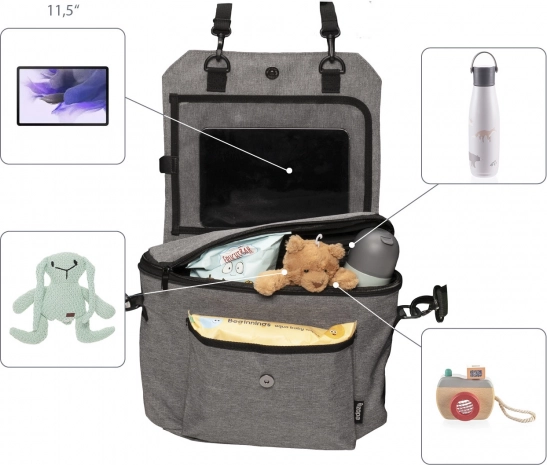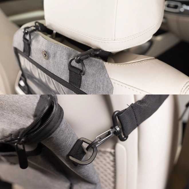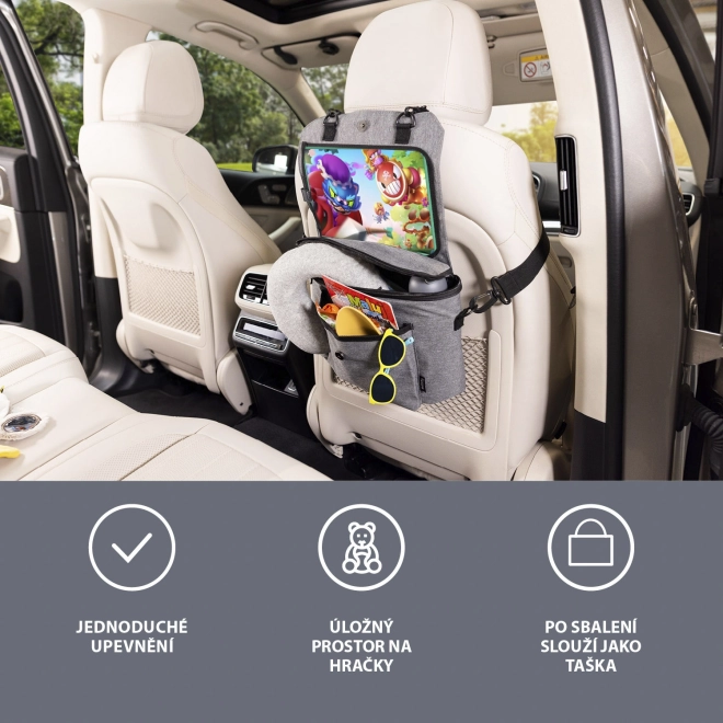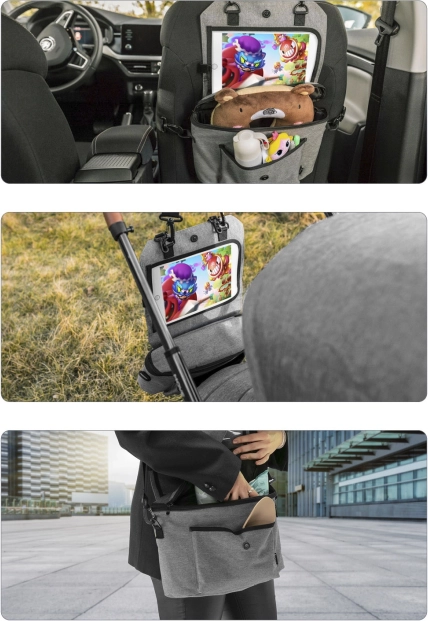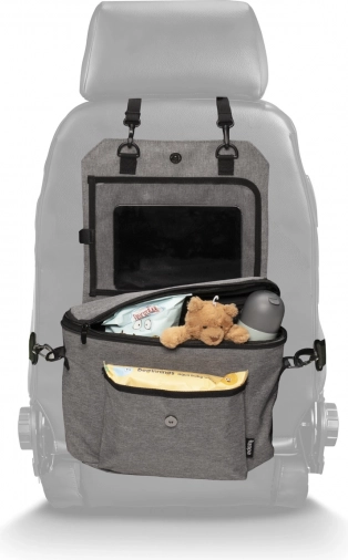 Organizér jednoduše zavěsíte na zadní stranu předního sedadla pomocí pevných popruhů. Když jej zrovna v autě nepotřebujete, stačí jej sbalit a použít jako stylovou tašku na kočárek nebo přes rameno. Odnímatelný držák tabletu lze využít i samostatně.