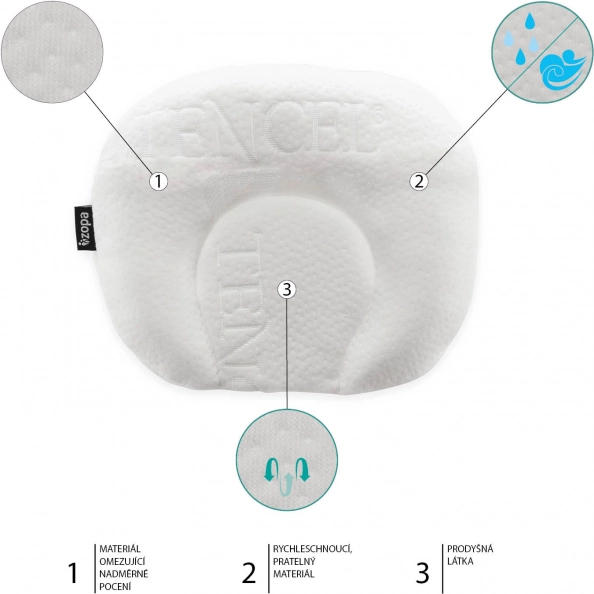 Polštářek se tvaruje podle hlavičky miminka, poskytuje stabilní podporu a zvyšuje komfort při spánku.