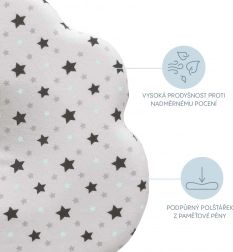 Dopřejte svému miminku maximální pohodlí a správnou oporu hlavičky. Tento měkký polštářek z paměťové pěny s motivem hvězdiček se dokonale přizpůsobí tvaru hlavy a díky speciálně tvarované středové části pomáhá předcházet syndromu ploché hlavy. Vhodný do postýlky, kočárku i autosedačky.