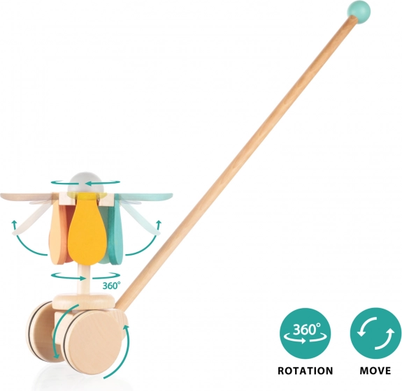 Dřevěný jezdík květina je ideální společník pro děti, které se učí chodit. Díky dlouhé tyči se dětem pohodlně ovládá, zatímco otáčející se květina udržuje jejich pozornost a podporuje přirozený pohyb. Kvalitní dřevěné zpracování bez ostrých hran zaručuje bezpečnou hru doma i venku.