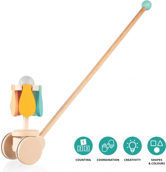 Roztomilý dřevěný jezdík ve tvaru květiny pomáhá dětem s prvními krůčky a promění každý krok v zábavu. Při jízdě se okvětní lístky otáčejí, květina se rozvíjí a zavíjí, a dítě tak přirozeně motivuje k chůzi a trénuje hrubou motoriku. Bezpečná konstrukce s pevnou dřevěnou tyčí a hladkými hranami je ideální pro malé průzkumníky od 16 měsíců.